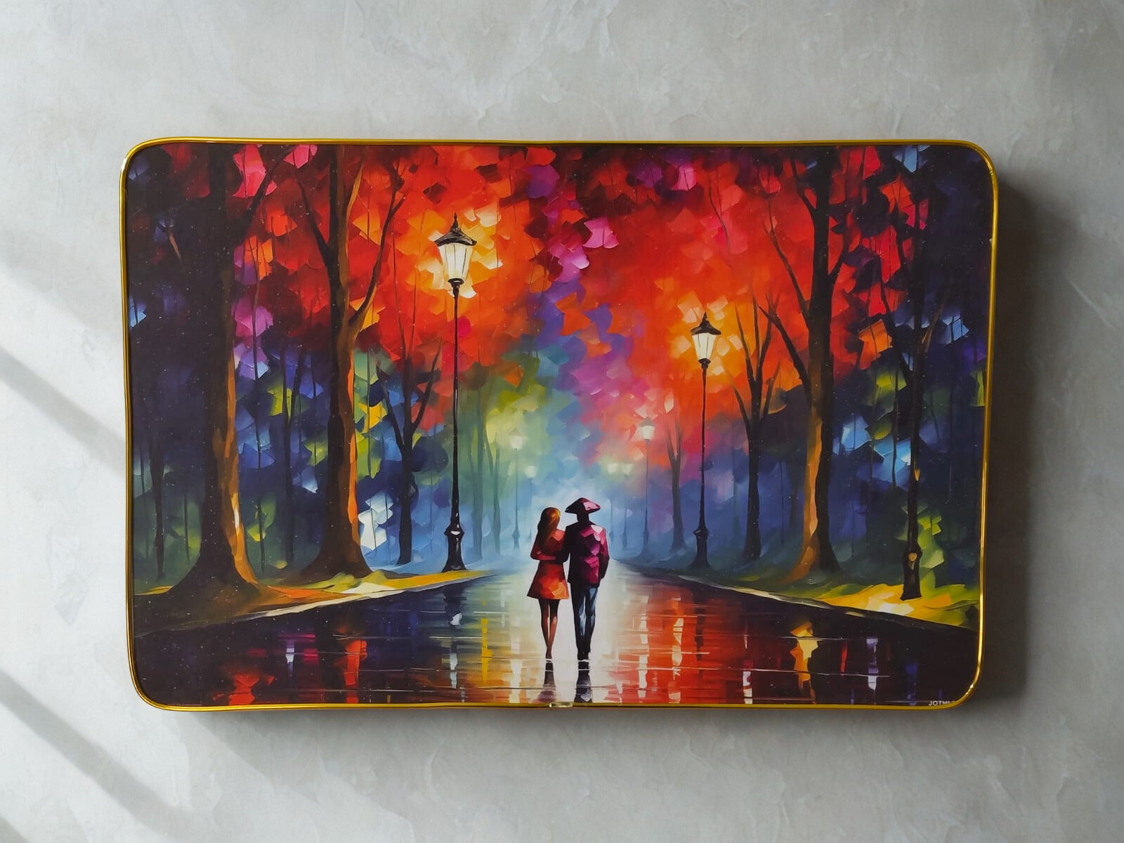 Transform your walls into a story of love and color with this enchanting painting. Featuring a couple strolling hand-in-hand beneath radiant streetlights, this artwork beautifully captures the essence of romance, serenity, and togetherness. The vivid strokes of red, orange, blue, and purple create a mesmerizing abstract backdrop that resembles a dreamy autumn evening, while the shimmering reflections on the wet pathway add depth and elegance. Ideal for living rooms, bedrooms, or hallways, this piece is not just a painting but a mood—evoking warmth, passion, and artistic charm. A perfect statement art piece for those who wish to make their homes feel alive and soulful