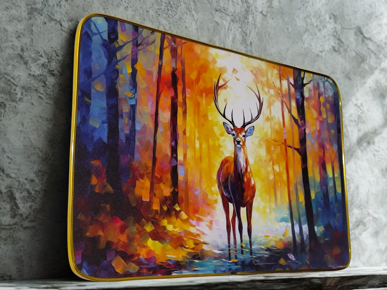 Bring the untamed beauty of the wild into your space with this striking painting of a stag standing tall in a radiant forest. The majestic deer, symbolizing courage, grace, and nobility, is illuminated by a golden backdrop of fiery autumn hues blending into cool twilight blues. The sharp contrasts and abstract strokes capture both the serenity and strength of nature, making this artwork a true centerpiece. Ideal for living rooms, offices, or cabins, it creates an atmosphere of power, elegance, and connection with the natural world. A must-have for wildlife lovers and those who appreciate art that speaks of freedom and majesty.